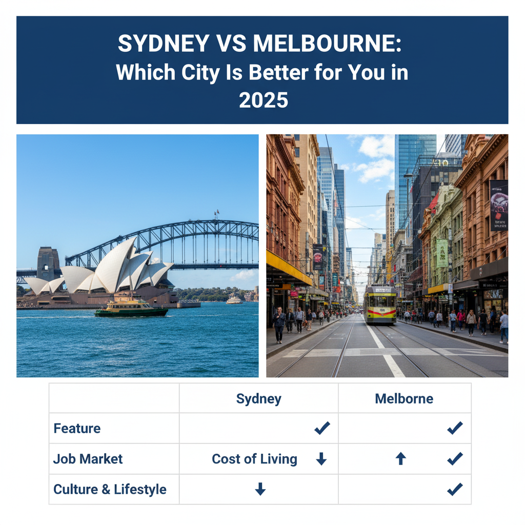 Compare Sydney and Melbourne in 2025 on cost of living, lifestyle, job opportunities, housing, and culture to decide which city suits your needs best.